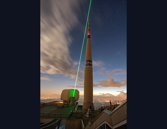 מגדל התקשורת בגובה 124 מטרים וקרן הלייזר הסמוכה, פסגת הר סנטיס, שווייץ | מתוך מאמר המחקר