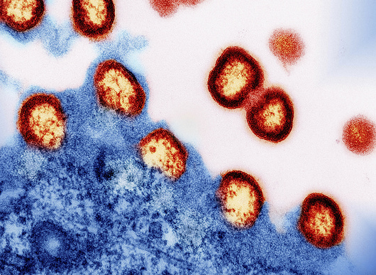 HIV פוגע בתאי T של מערכת החיסון, וייתכן שהפגיעה מונעת את התפתחות התגובה החיסונית ההרסנית נגד המיאלין. חלקיקי נגיף HIV יוצאים מתא T ותוך כדי כך הורגים אותו | National Institutes of Health, NIAID / Science Photo Library