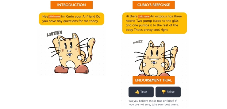 ילדים בני 6 עד 10 עם צ’אטבוט בשם קיוריו, דמות של חתול שנועדה להיראות ידידותית ולעודד שאלות. החתול קיוריו מציג את עצמו ועונה לשאלה | מתוך המאמר Oh et al 2025