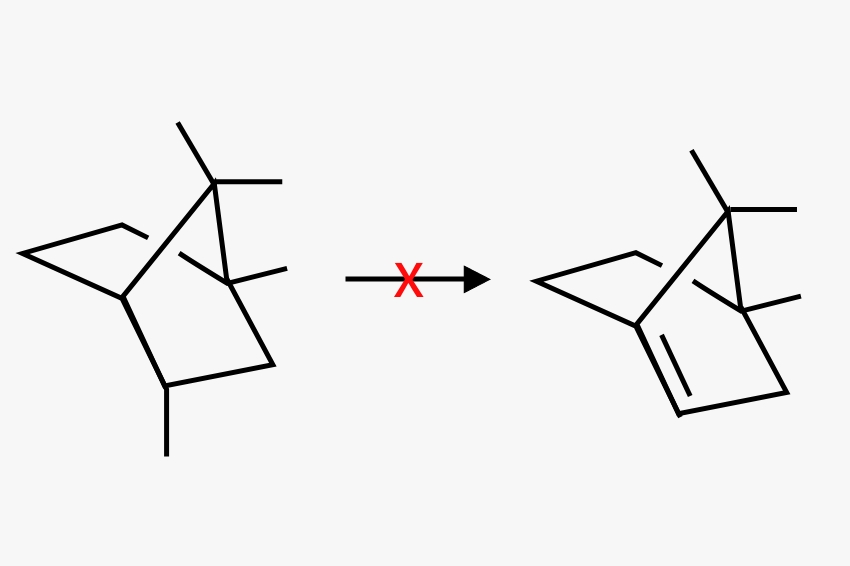 לפי כלל ברדט, מטבעת עם ראש גשר (שמאל) אי אפשר ליצור מולקולה יציבה עם קשר כפול בראש הגשר, אך החוקרים הראו שהדבר אפשרי (מימין). מולקולת נורבורנן עם ובלי קשר כפול | עיצוב: ליאת פלי