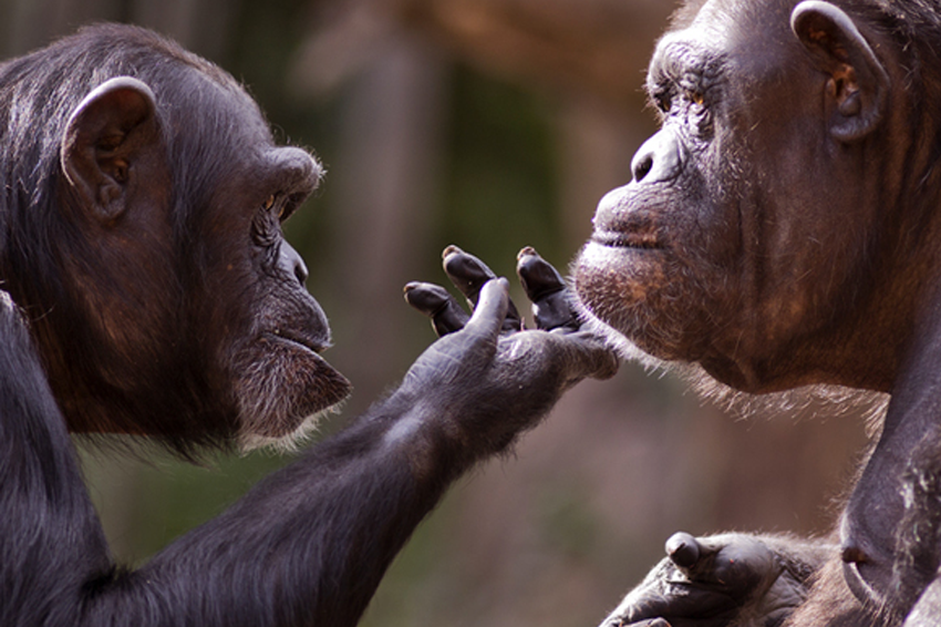 פרימטים, כמו בני אדם או שימפנזים, משתמשים בתנועות גוף לתקשורת. שימפנזים מתקשרים ביניהם | צילום: Patrick Rolands, Shutterstock