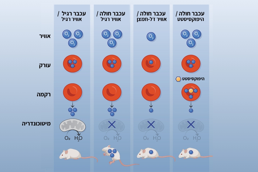 איך מגיבים עכברים בריאים ועכברים חולים בתסמונת ליי לשלושה מצבים: אוויר רגיל, אוויר דל חמצן ואוויר רגיל עם מתן היפוקסיסטט | מתוך Blume et al., 2025