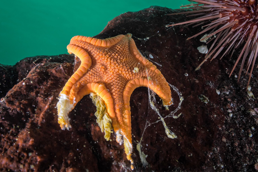 המחלה גורמת לכוכבי הים פצעים ועיוותים בזרועות, הם מאבדים צורה ומרקם ולבסוף הם מתים. כוכב ים חולה לחופי בריטיש קולומביה, קנדה | Photo courtesy of Grant Callegari/Hakai Institute