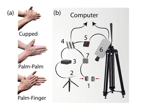 משמאל: שלוש הדרכים העיקריות למחיאת כפיים שנבדקו; מימין: מגוון שיטות מדידה למחיאת הכף (1), כגון מיקרופון (2), מגבר (3), מצלמה (6) וחיישן לחץ (7) | מתוך Fu et al., 2025