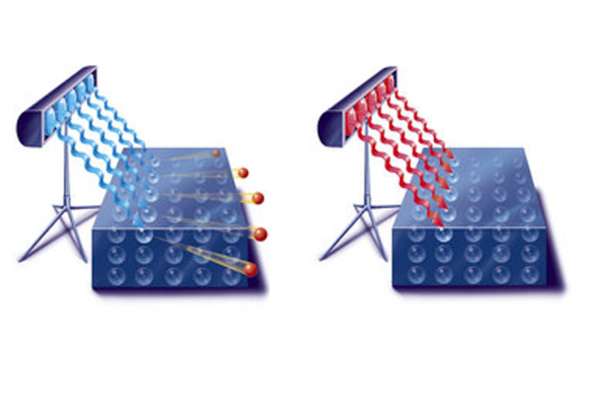 אלברט איינשטיין פענח את האפקט הפוטואלקטרי, והראה שהאנרגיה של הפוטונים צריכה להיות גבוהה מספיק כדי לגרום לאלקטרון להשתחרר ממקומו בחומר ולהגיב. האור הכחול משחרר את האלקטרונים (משמאל), אך לאור האדום אין מספיק אנרגיה, והאלקטרונים לא מגיבים | JACOPIN / Science Photo Library