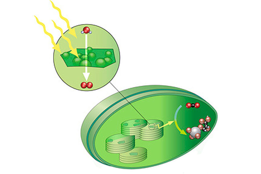 הפוטוכימיה היא מנוע בלתי-נראה שמאפשר את החיים בכדור הארץ. אילוסטרציה של תהליך הפוטוסינתזה, שמתחיל בפגיעת אור השמש בעלה | QA International / Science Photo Library