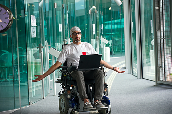 האופציה הפשוטה לקריאת אותות מוח. חוקר מדגים שליטה בכיסא גלגלים חשמלי באמצעות כובע על אלקטרודות EEG | צילום: PHILIPPE PSAILA / SCIENCE PHOTO LIBRARY