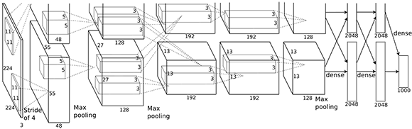 מהפכה בטכנולוגיות זיהוי בזכות שכבות מרובות של רשתות עצבים מלאכותיות. הארכיטקטורה של AlexNet מתןך מאמר המחקר של Zhang, Aston and Lipton, Zachary C. and Li, Mu and Smola, Alexander J, מקור: ויקיפדיה
