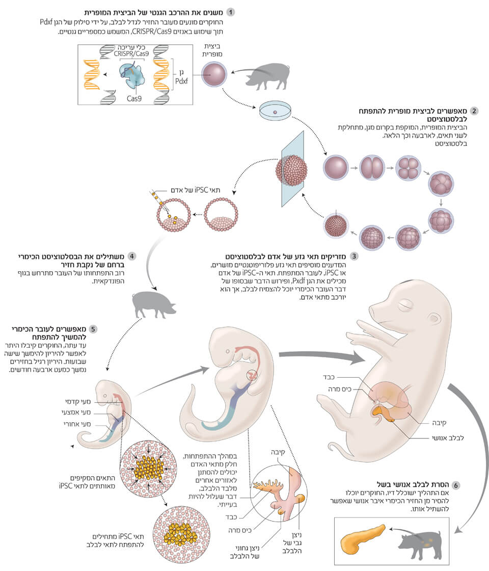 הרעיון אולי נשמע מרחיק לכת, אבל חוקרים בארה"ב וביפן כבר הראו שהדבר אפשרי באופן עקרוני. כמה צוותים שונים הזריקו תאי גזע של חולדה לעוברים של עכברים, שההרכב הגנטי שלהם תוכנן מראש, והעבירו את העוברים לרחם של נקבות עכבר פונדקאיות. לאחר כמה שבועות של היריון, המליטו הפונדקאיות בעלי חיים שנראו והתנהגו כמו עכברים, למעט העובדה שלכולם היה לבלב של חולדה. חוקרים במעבדה שלי ובקבוצות מחקר אחרות עשו צעד נוסף, והזריקו תאי גזע של אדם לעוברים של חזירים. כמה מן ההזרקות האלה נקלטו, והצלחנו לוודא שהרקמה האנושית התחילה להתפתח באופן תקין. אחר כך העברנו את העוברים הכימריים לרחם של חזירות פונדקאיות, שם הנחנו להם להתפתח במשך שלושה-ארבעה שבועות. לאחר שנערוך עוד כמה ניסויים בשלבי ביניים, נאפשר לעוברים להתפתח במשך חודשיים-שלושה, ולאחר פרק הזמן הזה, נברר כמה מן התאים שלהם הם תאים של אדם. בהנחה שהניסויים האלה יעלו יפה – ושנקבל היתרים מרשויות מדינה ומרשויות מקומיות להמשיך בניסויים – אנו מצפים לאפשר לעוברים לגדול עד גמר ההיריון (הנמשך ארבעה חודשים אצל חזירים).