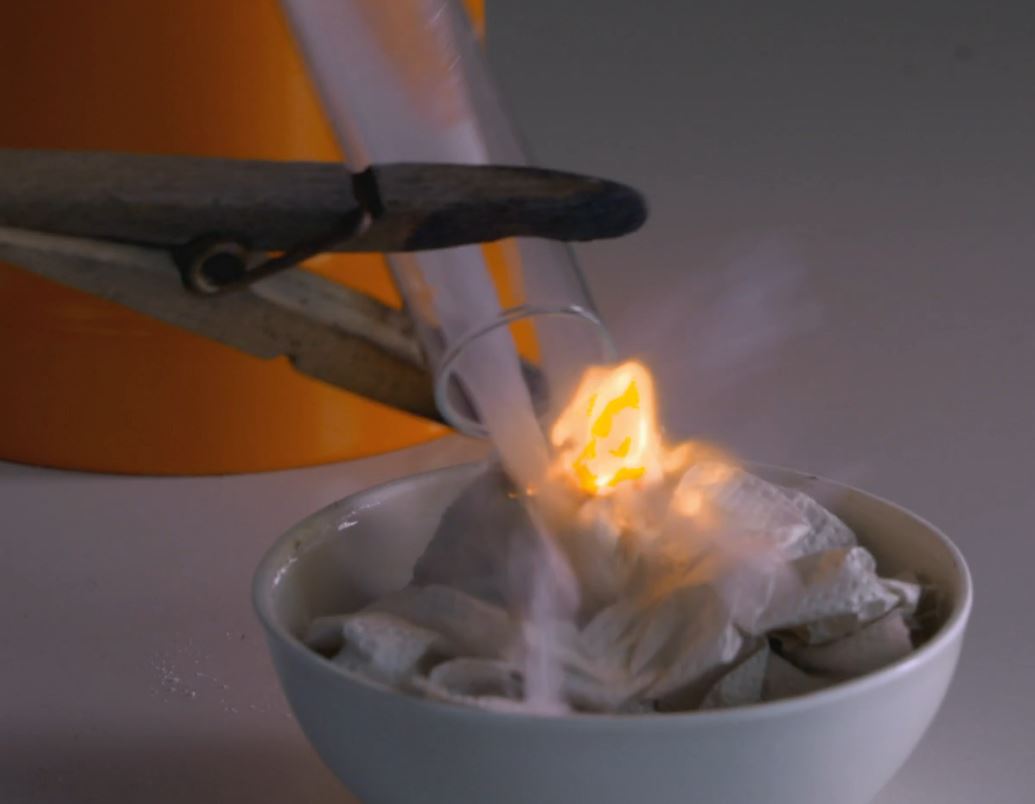 يمكن إنتاج سوائل كيميائية خطيرة جداً في مختبر الكيمياء: سوائل تؤدي إلى اندلاع النيران في أي مادة قابلة للاشتعال فيما إذا لمستها، إلى أن تأتي النارعليها تماماً. شاهدوا عرضاً لمادة كهذه، وانظروا كيف أن ملامستها للورق وأيضا ملامستها لبضع وجبات شعبية خفيفة (البسلي والبمبا) تؤدي إلى اندلاع النار