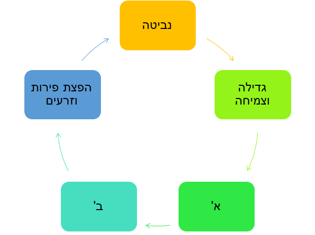 התבוננו בתרשים המתאר את מחזור חיי הצמח, שבוחסרים שלבים א' וב'. בחרו בתשובה הנכונה ביותר לשלבים אלה.